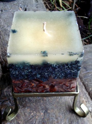 Vela quadrada decorada com canela e trigo misturada à parafina